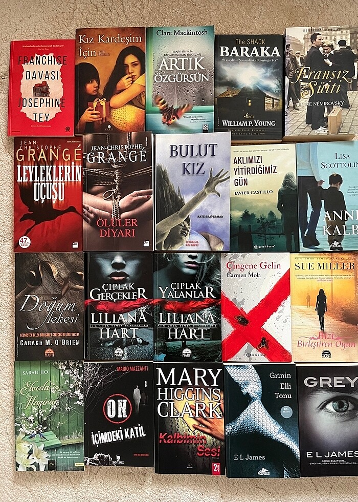 Yepyeni gibi. Kız kardeşim için Baraka Artık özgürsün Fransız süiti Bulut kız Aklımızı yitirdiğimiz gün Çıplak yalanla/çıplak gerçekler Doğum lekesi Çingene gelin Leyleklerin uçuşu Ölüler diyarı İçimdeki katil Anne kalbi Franchise davası Bizi birliştiren oyun Elveda haziran Kalbimin sesi Grinin elli tonu Grey (Adet 75 liradır.)