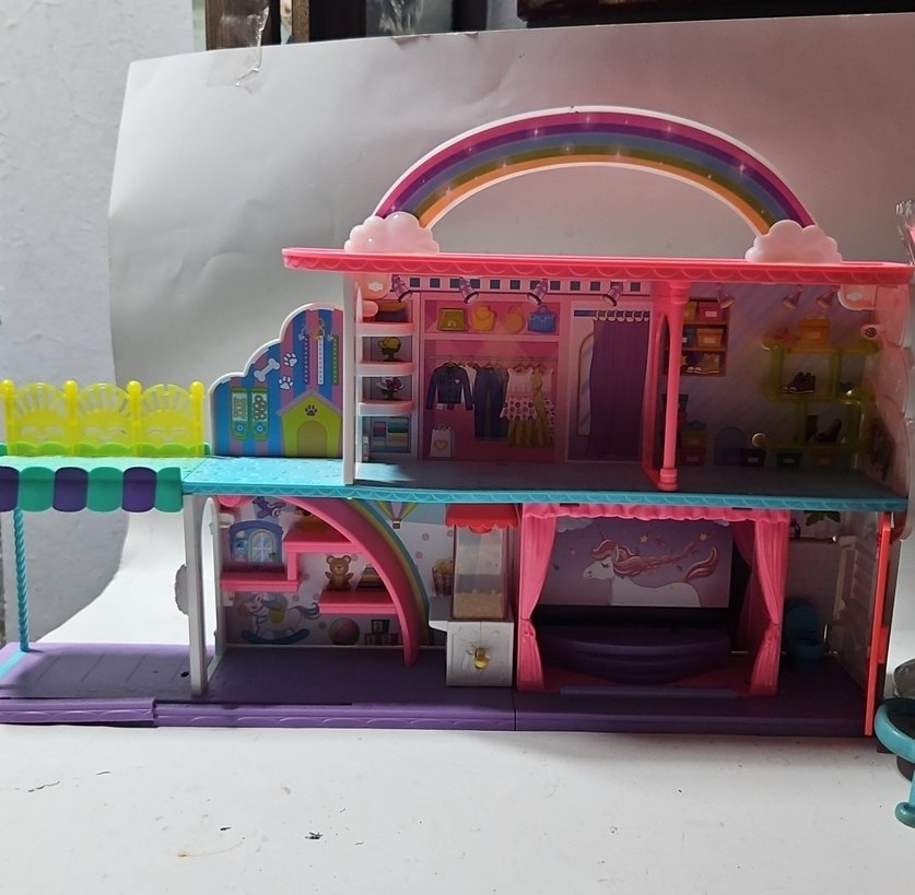 Çeşitli odalar ve üstte gökkuşağı kemeri bulunan renkli çok katlı oyuncak ev. Canlı detaylarla hayal gücünü destekler.