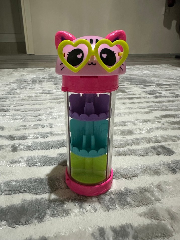 Kalp şeklinde gözlükleri olan kedi figürlü, Polly Pocket Stil Döndürücü Moda Dolabı. Ürün genel olarak temiz ve çalışır durumda.Kapağı eksik. Arka sağ kulakta küçük bir boya izi bulunmaktadır (fotoğraflarda gösterilmiştir). Bu küçük kusurlar dışında üründe herhangi bir kırık veya çatlak yoktur. Koleksiyon veya oyun amaçlı kullanılabilir.