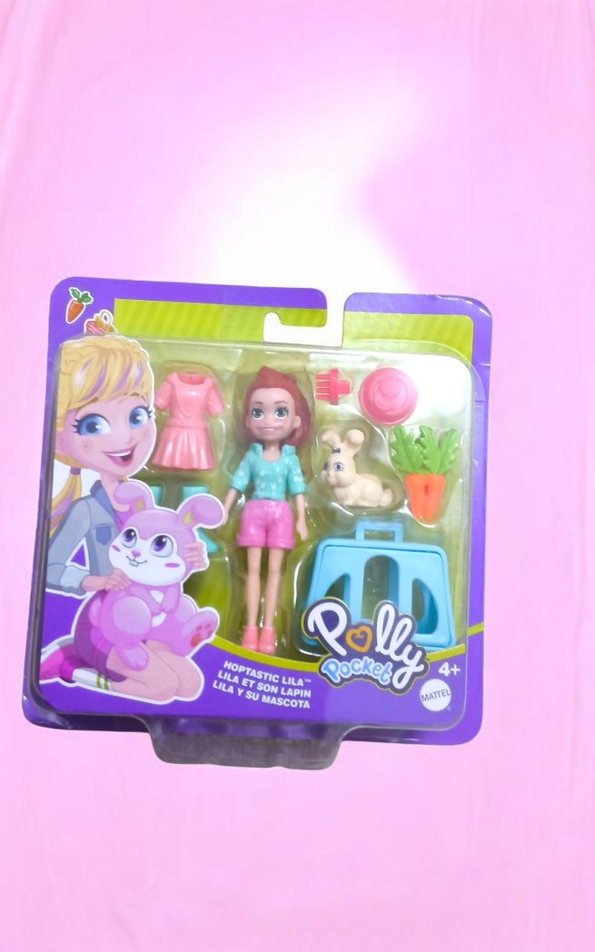 Renkli Polly Pocket bebeği, çeşitli canlı kıyafetler ve aksesuarlarla birlikte gelir.