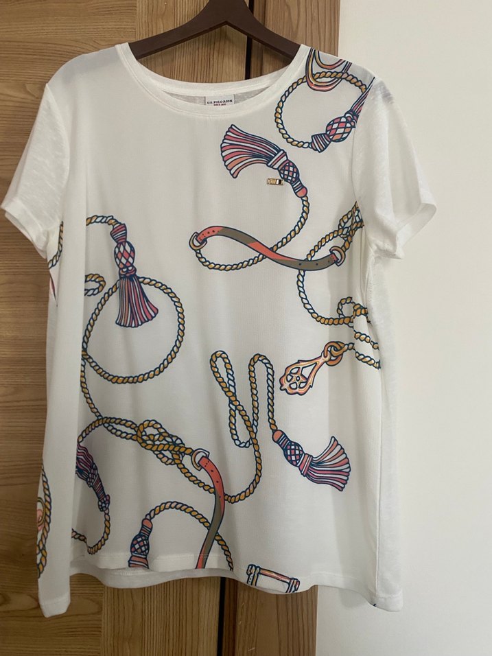 1 kere giydim. Hiç bir kusuru yok. Pamuk kumaştan, kısa kollu ve bol kesimli beyaz tişört. Zincir baskılı deseni ve yuvarlak yaka tasarımıyla günlük sokak stiline uygundur.
