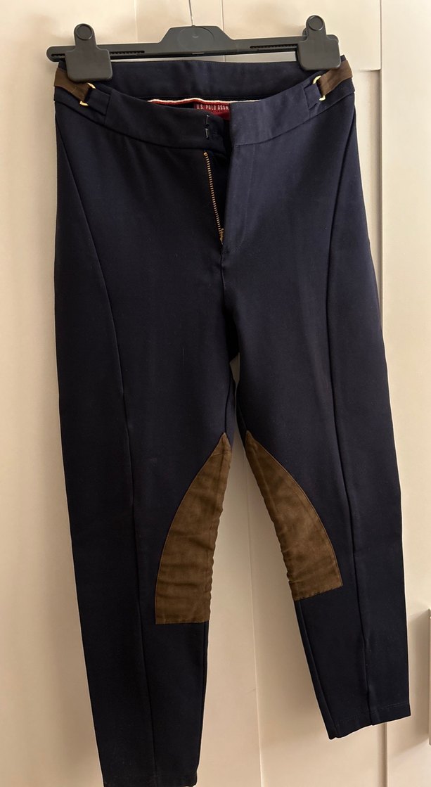 Kahverengi süet detaylı, dar kalıp, yüksek belli polo binici pantolonu. Tayt gibi esnek yapıda, oldukça tok bir kumaşı var. Hiçbir kusuru yok.