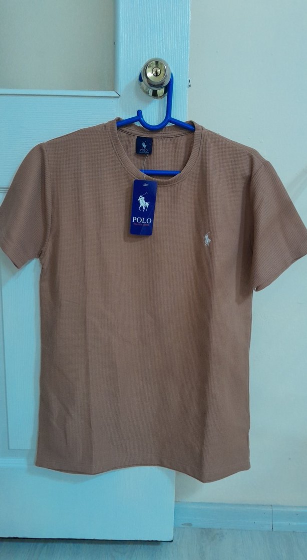Kahverengi POLO erkek tişörtü, kısa kollu ve yuvarlak yaka detayına sahip. Düzgün sentetik kumaştan, rahat kesim ve baskılı desen içeriyor. L beden etiketli