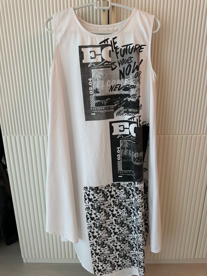 Polo Garage 1 beden dökümlü, rahat kesim elbise. Önü uzun, arkası hafif kısa ve yanlara doğru asimetrik gelen modern bir model. Üzerindeki siyah beyaz grafik baskılar ile spor-şık bir hava katıyor. Günlük kullanım, tatil veya şehir şıklığı için ideal. Temiz ve yıpranmamış, sadece birkaç kez giyildi.