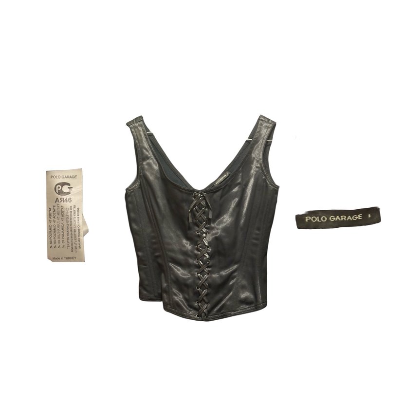 Polo Garage saten görünümlü korse onunde deri bagcik detaylari ve arkasinda fermuari bulunmaktadir herhangi bir defosu yok