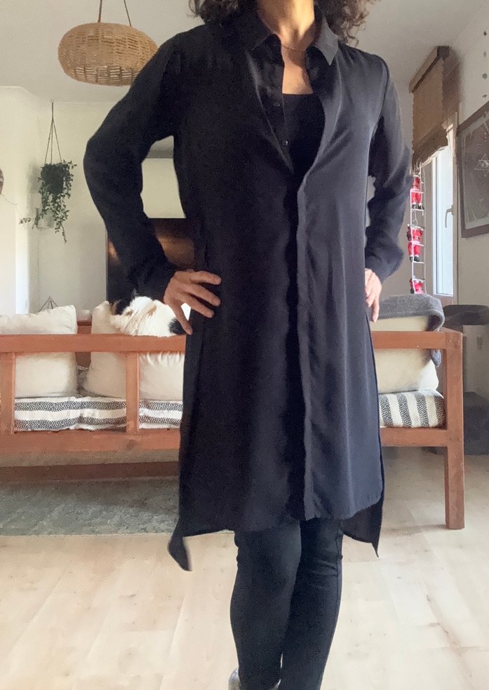 Siyah, dökümlü ve uzun kesim gömlek, mat siyah renkte ve şık görünümlüdür.