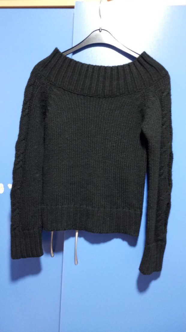Siyah triko kadın kazak, yuvarlak yaka ve uzun kolludur. Dar kesim, midi boyda ve rahat goth tarzındadır.