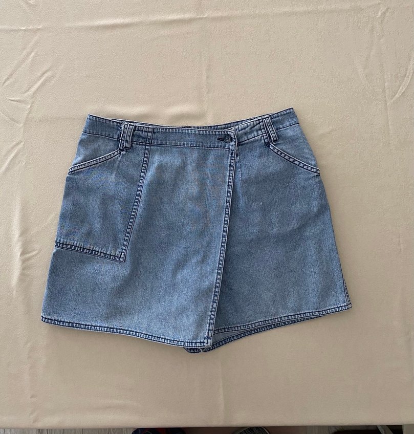Polo Garage Tür: Denim Etek-Pantolon (Skort) Beden: 40 (L) Durum: Çok temiz, kondisyonu yüksektir. Herhangi bir lekesi veya deformasyonu yoktur. Özellikler: • On kısmı şık bir etek görünümünde (wrap detail), arka kısmı ise konforlu bir şorttur. • Açık mavi (light wash) denim kumaş. • Arka cepleri kapaklı ve düğmelidir; ön tarafta yan cepleri mevcuttur.