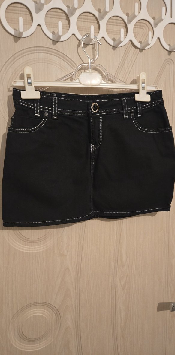 Siyah kot kumaştan, kemerli ve dikiş detaylı, kısa ve dar kesim mini etek. Günlük ve sokak stiline uygun rahat bir model. uzunluğu 32
