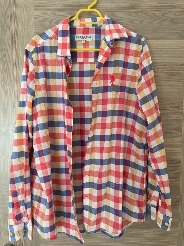 Kadınlar için uzun kollu, yakalı ve düğmeli gömlek. Gevşek kesim ve midi boyda. Hafif çok renkli kareli desene sahip, sentetik kumaştan yapılmıştır. Us polo marka M beden (38) az kullanıldı