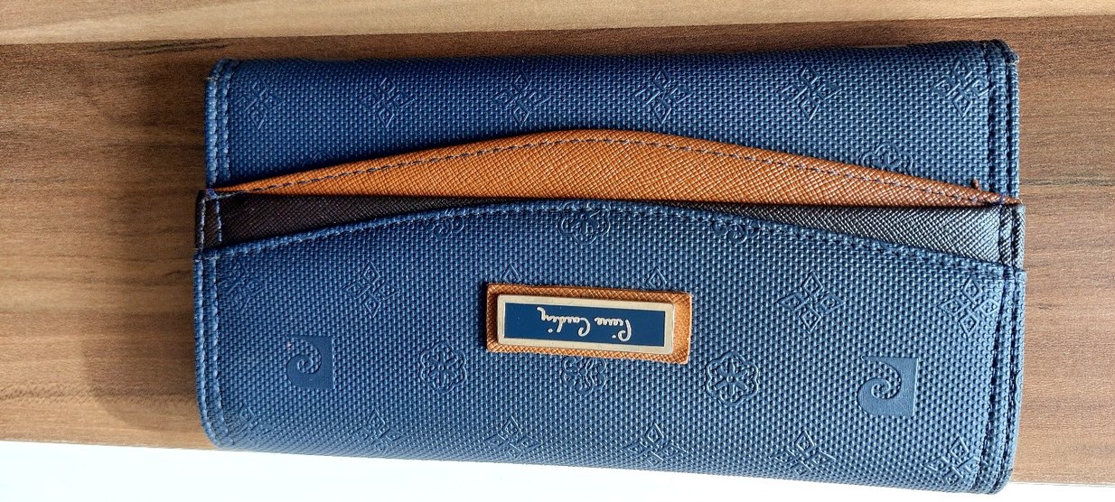 Parlak laciverti renkte, dokulu desenli ve küçük etiket detaylı vintage tarzı kadın cüzdan