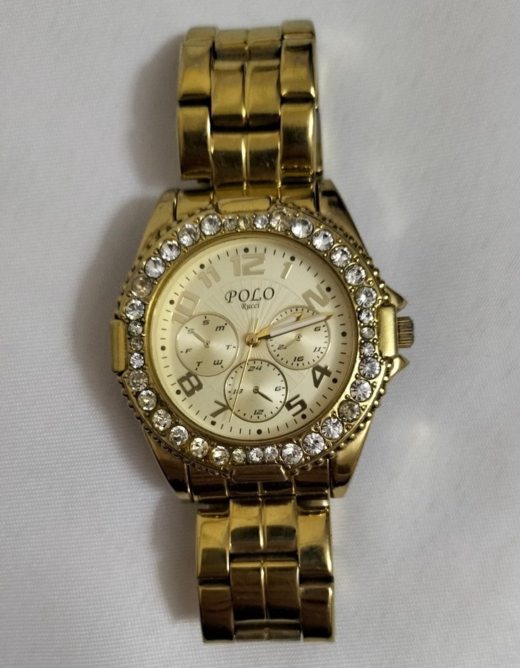 Polo marka, taşlı parlak gold kadın saati. Klasik tasarımlı, çoklu alt kadranlı, sokak stiline uygun. Sıkıntısız çalışıyor.