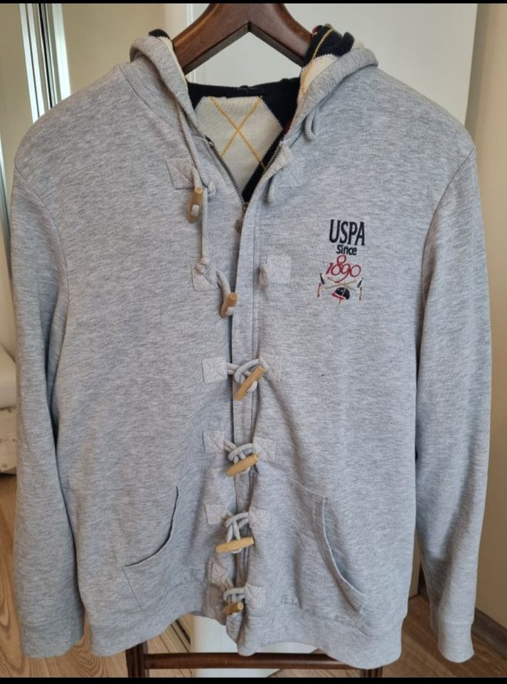 Gri kapüşonlu, düğmeli erkek sweatshirt, rahat kesim ve yumuşak dokulu kumaştan. Baskılı detayları ve ön cepleriyle günlük sokak stili için uygundur. iki koltuk arası 62 cm, uzunluk 71 cm.