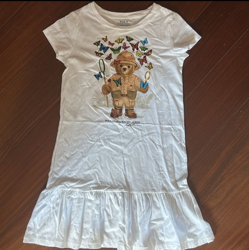 Kısa kollu, yuvarlak yaka ve pamuklu kumaşlı kız çocuk tişörtü. Alt kısmında fırfır detayı ve kelebeklerle birlikte ayı baskısı bulunur.