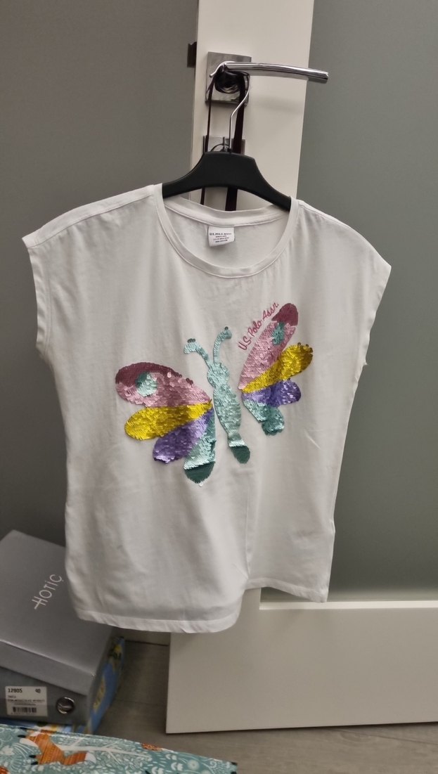 Polo marka on üç-on dört yaş Kız çocukları için bol kesim, yuvarlak yaka ve kısa kollu tişört. Renkli kelebek baskısı ve payet detayları bulunur, sokak stili için uygun, yumuşak sentetik kumaştan yapılmıştır.