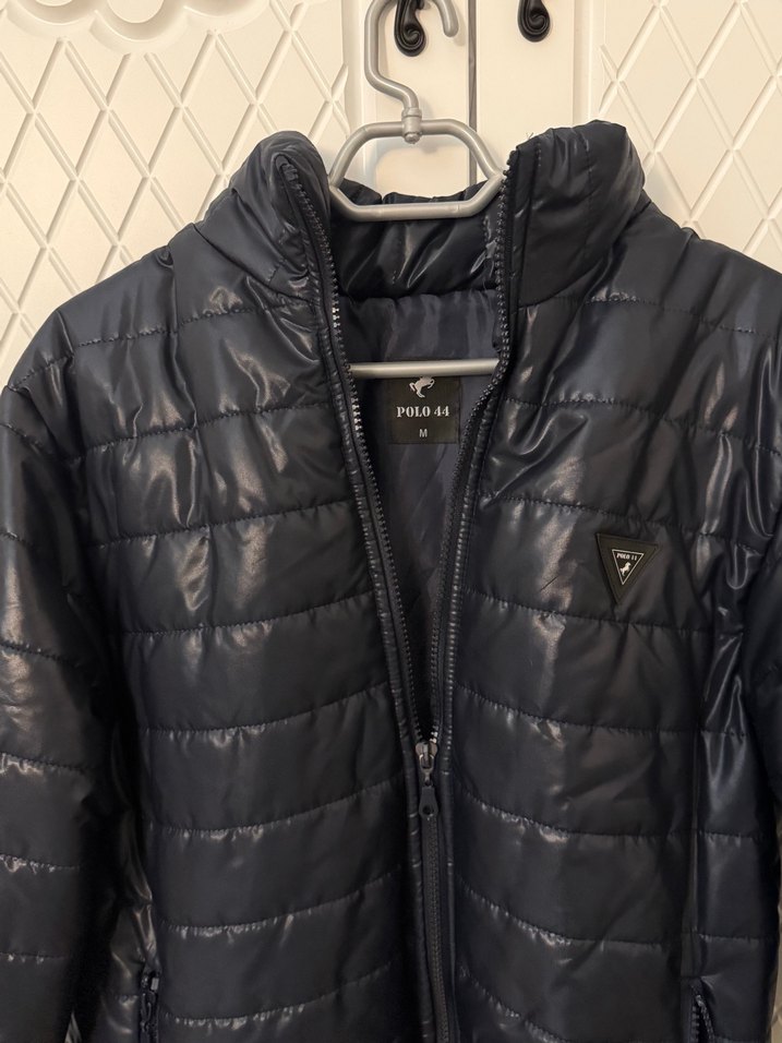 Polo fermuarlı, lacivert parlak sentetik kumaştan yapılmış, normal boy ve dar kesim kadın kışlık ceket. Notch yaka ve askılı kollu, genç ve şık athleisure tarzda günlük kullanım için uygun. M beden