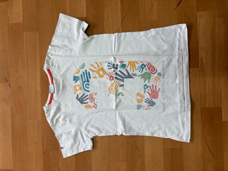 Polo marka. 9-10 yaş. Baskılı renkli el izleri desenine sahip, kısa kollu ve yuvarlak yakalı beyaz kız çocuk tişörtü. Yumuşak dokulu kumaştan, günlük kullanıma uygun. ✋