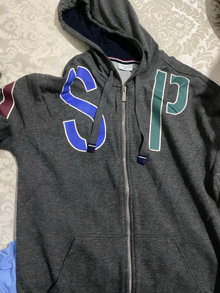 için gri, fermuarlı, kapüşonlu sweatshirt. Yumuşak ve sıcak kumaştan, uzun kollu, baskılı, sokak stili için uygun.