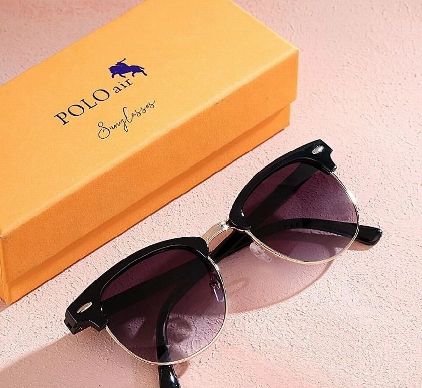 polo parlak siyah kadın güneş gözlüğü, modern klasik tasarıma sahip, renkli camlı ve şık çerçevelidir.