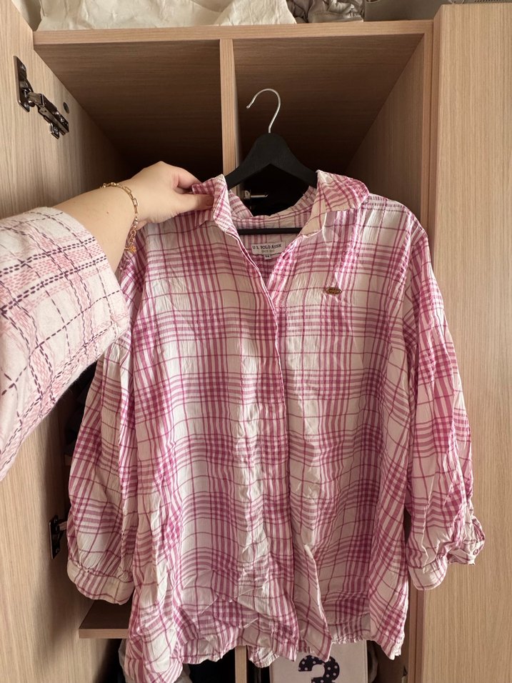 Pembe pastel tonlarında, düğmeli ve yakalı. Rahat ve şık sokak stili için uygundur. Polo, gömlek. 44 beden, 3-4 kere giyildi hiçbir defosu sıkıntısı yok.