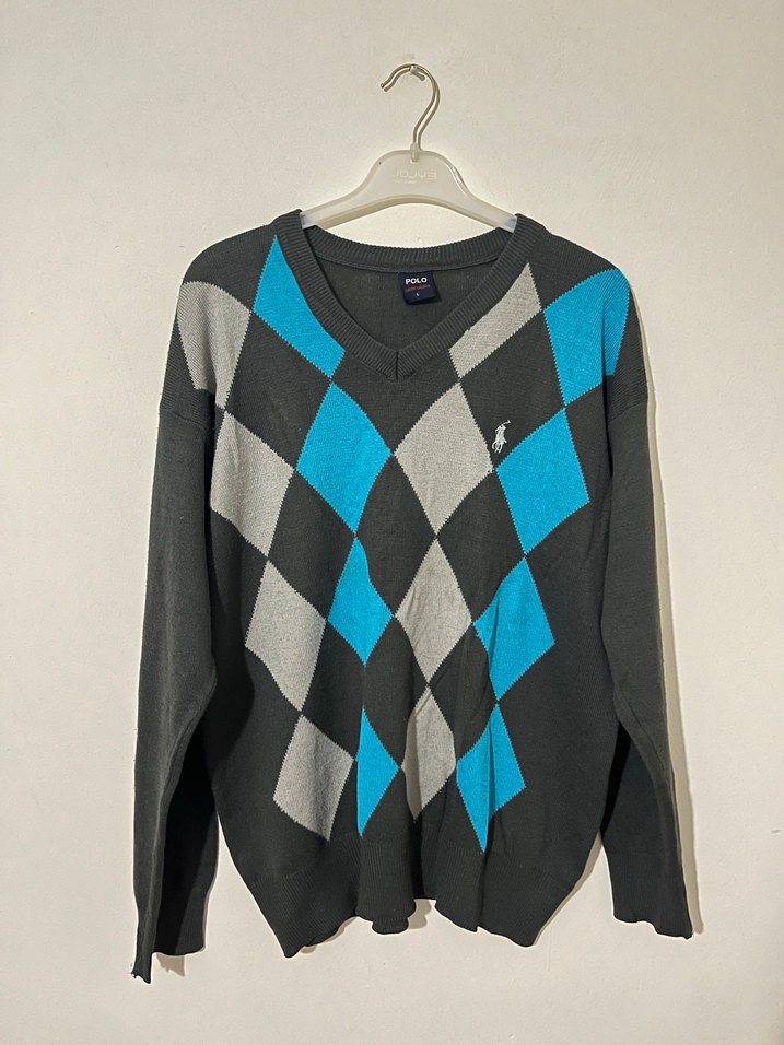 Polo Ralp Laurenin orjinal Gri, mavi ve açık gri renklerde baklava desenli, V yaka, uzun kollu, bol kesim erkek triko kazağıdır. Yumuşak ve sıcak kumaştan üretilmiştir. Fiyatı makul verilmiştir. Boy 64cm - Bel genişliği 58cm dir.