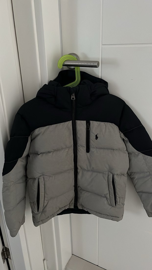 Fermuarlı ve kesimli Polo Ralph Lauren erkek çocuk mont, gri tonlarda yumuşak ve sıcak kumaştan, kapüşonlu ve cepli, şık sokak stili görünümüne sahip.