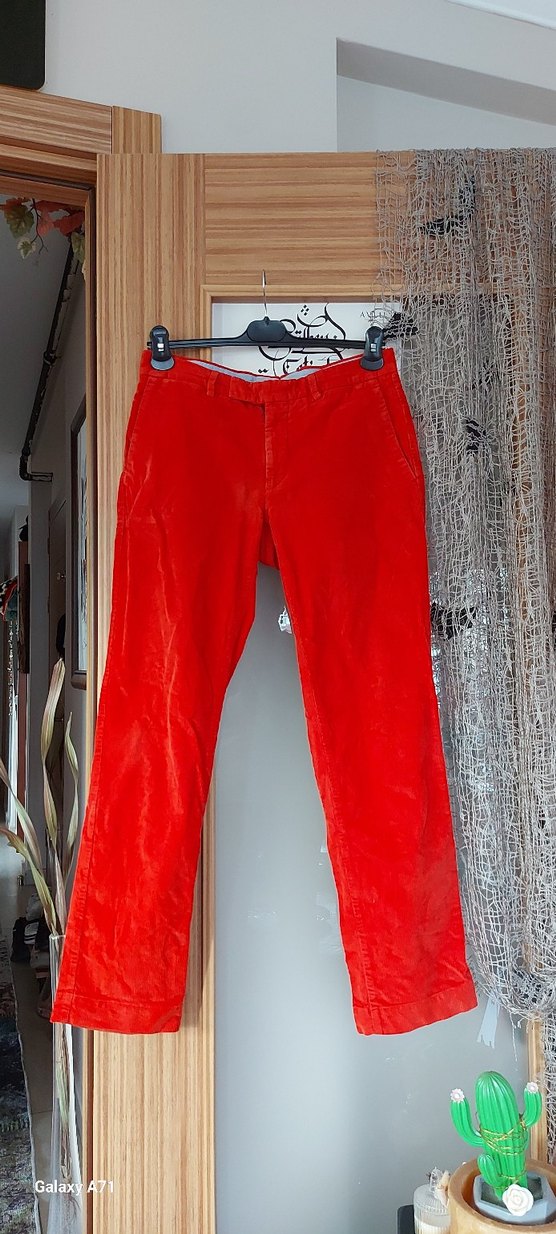 Epey giyildi ama deforme yok.Orjinaldir.Fitilli kadife,turuncu/kiremit.Fotolarda kırmızımsı duruyor ama değil.Son foto en yakın.Yazan beden bilgileri:30/34,46/L.