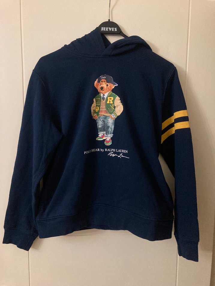 Mavi renkli, uzun kollu, bol kesim erkek çocuk sweatshirtü. Baskılı ayı deseni ve sarı çizgili örgü detayları bulunur. Yumuşak ve sıcak kumaşlı.