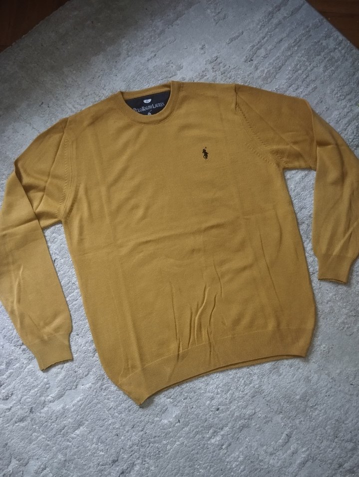 Hardal renkte Polo Ralph Lauren marka uzun kollu, yuvarlak yaka triko kazak. Düzenli kesim, örme dokulu ve yumuşak, sıcak bir his verir. Günlük kullanıma uygun.