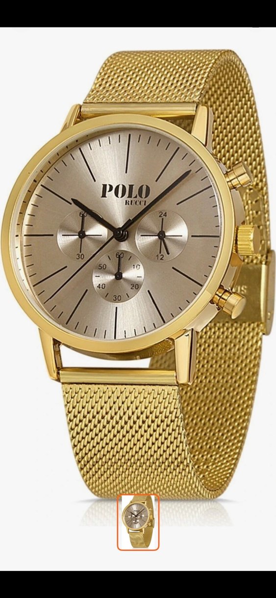 Polo erkek saati, parlak altın renginde, modern klasik tasarıma sahiptir. Örgü kayış ve üç alt kadran bulunur. ⌚ ☄️NOT: BU SAATİ YANINDA EKSTRA OLARAK 300 TL DEĞERİNDE ÇOCUK SAATİ HEDİYE EDİYORUM KIZ VE YA ERKEK SEÇİM SİZİN