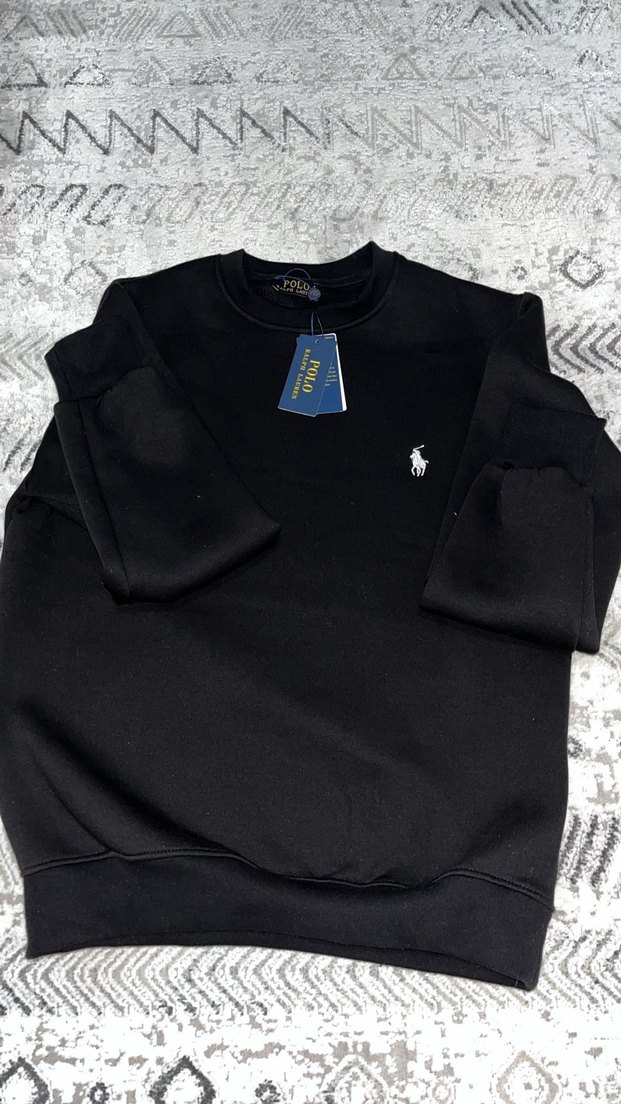 S-XXL VARDIRPolo siyah sweatshirt, bisiklet yaka ve uzun kolludur. Yumuşak ve sıcak kumaştan yapılmış, rahat kesim ve sade desensiz tasarıma sahiptir.