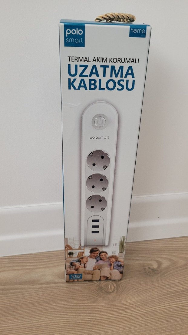 Beyaz renkte, termal akım korumalı uzatma kablosu. Üç priz ve üç USB portu ile çoklu cihaz bağlantısı sağlar. polosmart markalı. ⚡