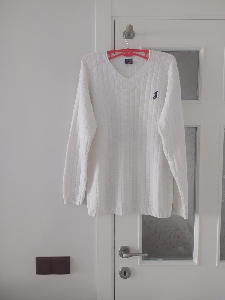 Polo Sport Marka örgü dokulu, V yaka ve uzun kollu beyaz pamuklu triko kazak. Rahat ve bol kesimi günlük kullanım için uygundur. Yenidir. Etiketi kopmuştur.