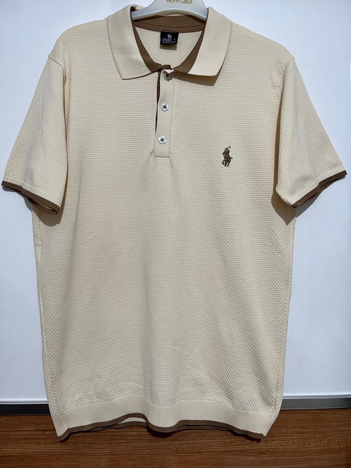 Bej renkte, kısa kollu, yakalı ve düğmeli kısa boy polo tişört. Yumuşak sentetik kumaştan, rahat kesim ve gündelik sokak modası tarzında. Rengi görseldeki gibi