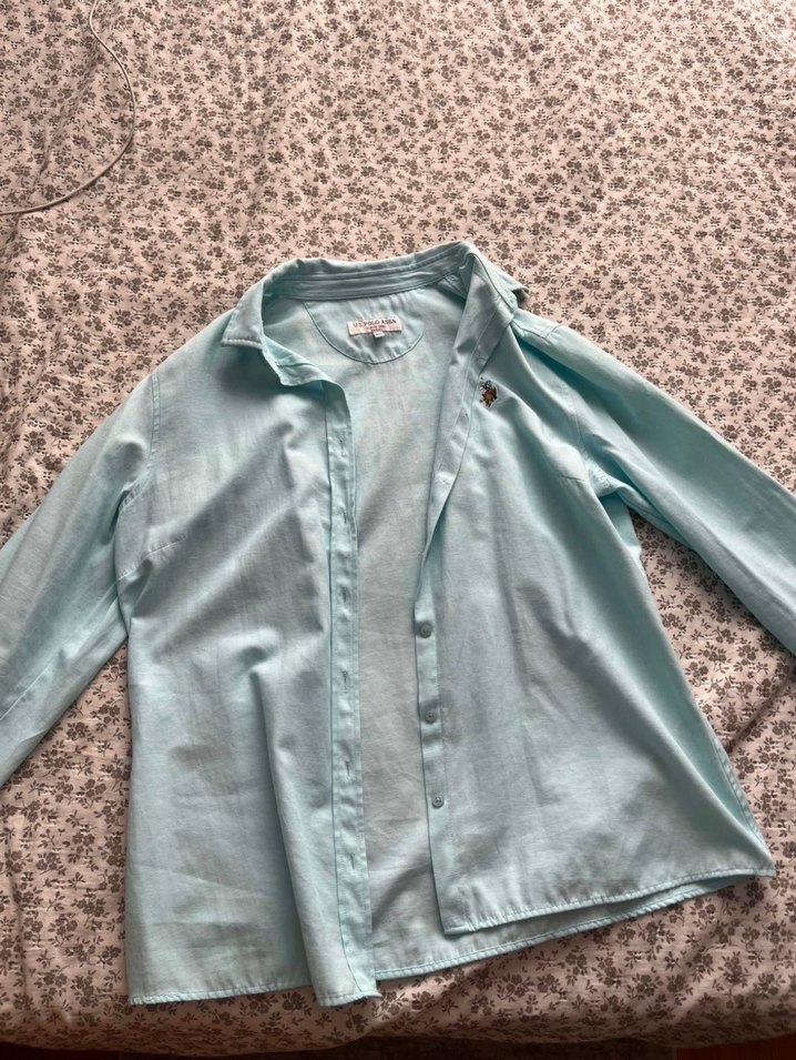 Turkuaz renkli, uzun kollu keten gömlek. Bol kesim ve yakalı, düğmeli tasarımıyla günlük ve rahat kullanıma uygun.