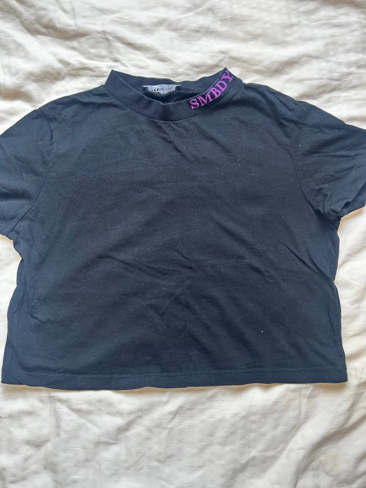kısa kollu, polo yaka, bol kesim Koyu mor renkte, yakada "SMBDY" detayı bulunur. Trend sokak giyimi için uygundur.