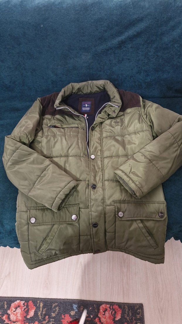 Düğmeli, yakalı ve uzun kollu erkek mont. Yumuşak, tertemiz. M L arası