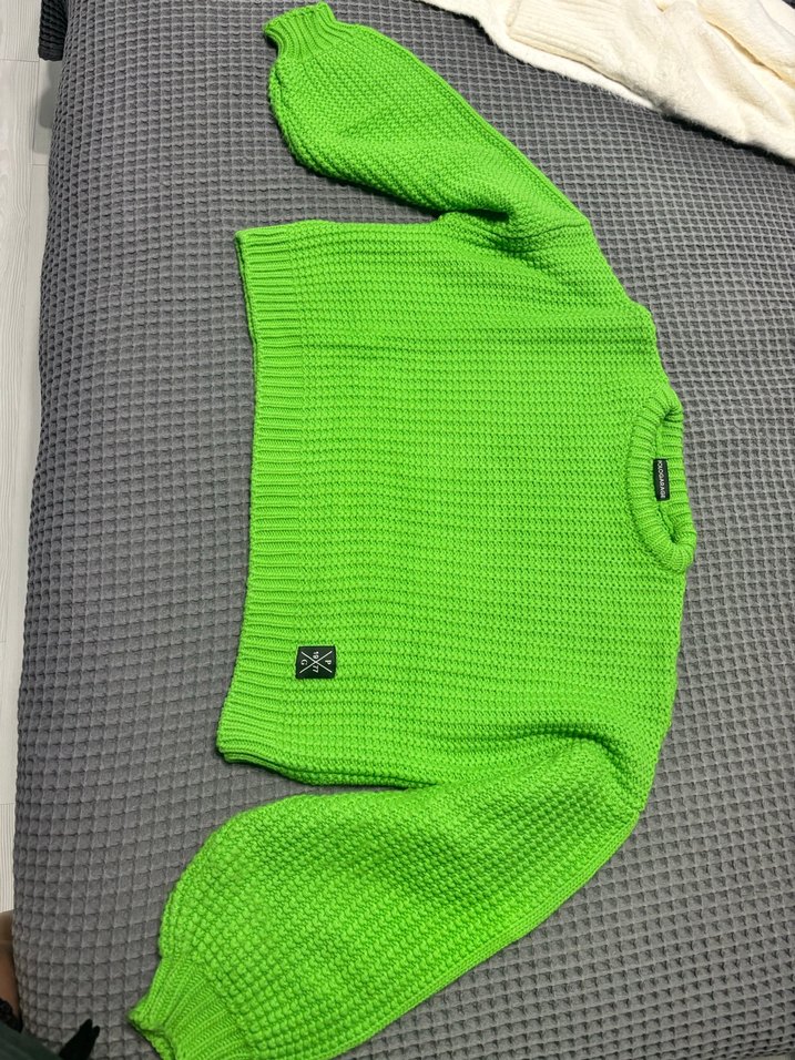 Yeşil, uzun kollu ve bisiklet yaka örgü triko kazak. Rahat ve renkli tasarımıyla günlük kullanıma uygundur.