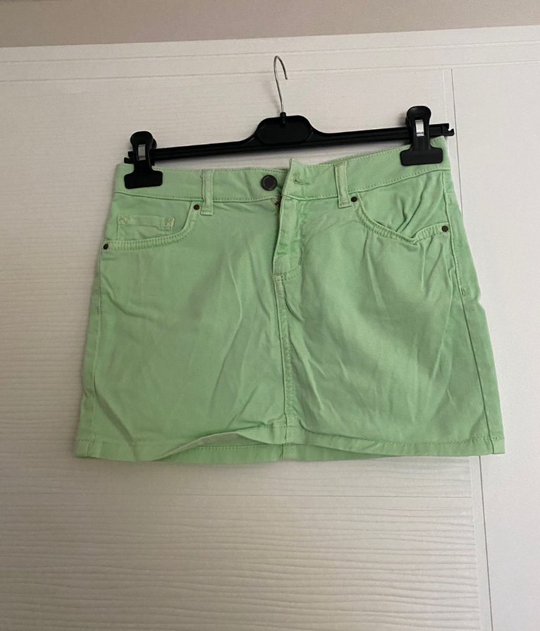 Beltli, pastel yeşil renkli, denim kumaştan yapılmış, dar kesim mini etek. Günlük sokak stiline uygun.