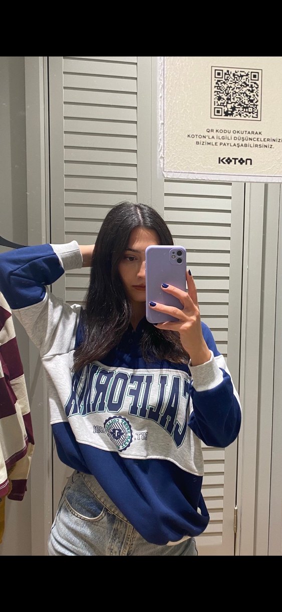 Pamuklu, uzun kollu ve düğmeli, salaş kesim sweatshirt. Gri ve lacivert renkte, yazılı ve baskılı tasarıma, polo yaka kolej tarza sahip.
