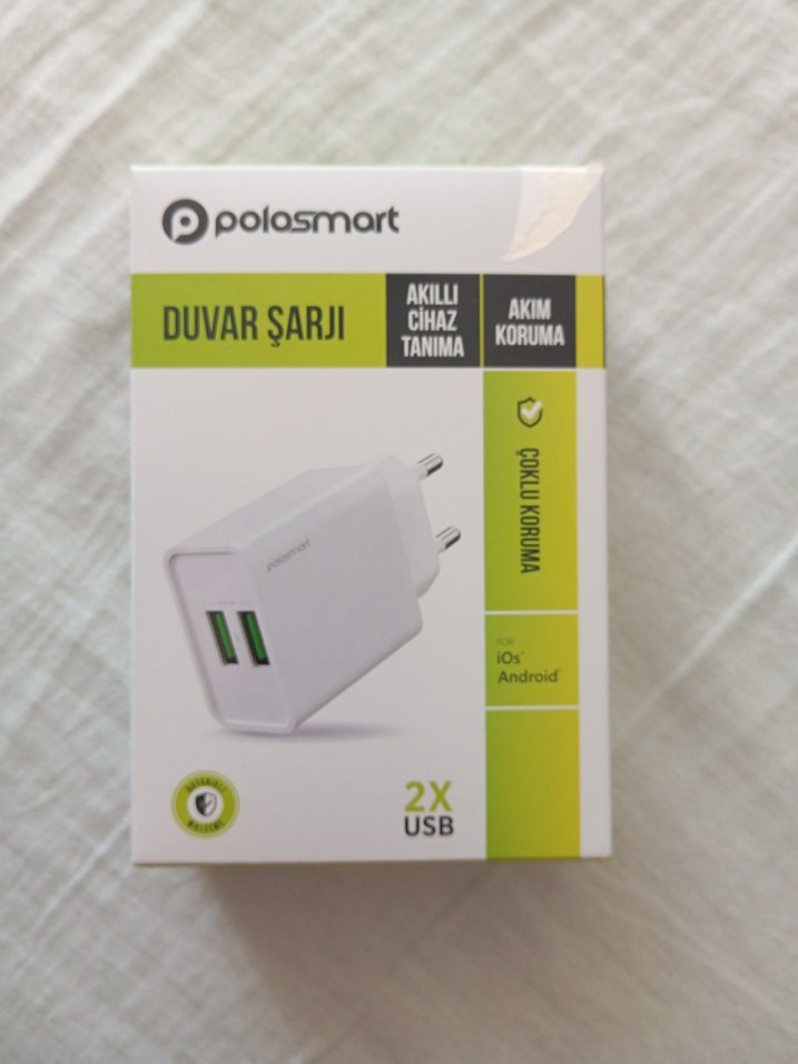 Polosmart beyaz duvar şarjı, 2 USB portlu, akıllı cihaz tanıma ve akım koruma özellikli. iOS ve Android uyumlu, çoklu koruma sağlar. ⚡