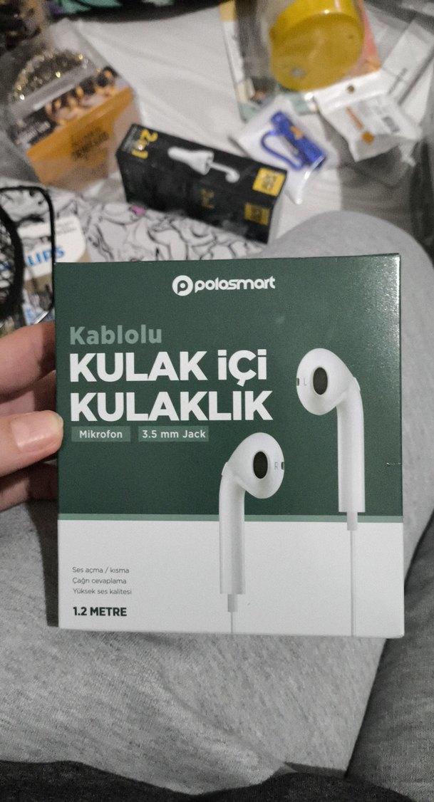 1.2 metre kablolu, 3.5 mm jaklı beyaz kulak içi kulaklık, mikrofonlu, ses açma-kapama ve çağrı cevaplama özellikli.