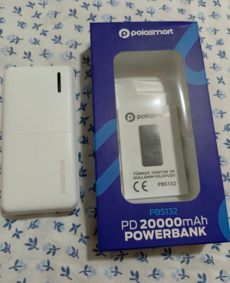 Polosmart PBS132 powerbank, 20000mAh kapasite, beyaz renkte, PD desteği ve CE sertifikası ile kullanıma hazır.