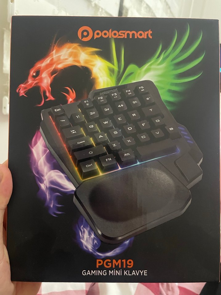 Polosmart PGM19, çok renkli ve karanlık tonlarda mini gaming klavye olup, kompakt tuşlar ve bilek desteği sunar. Oyun odaklı fonksiyonlara sahiptir. Kutulu hiç kullanılmadı