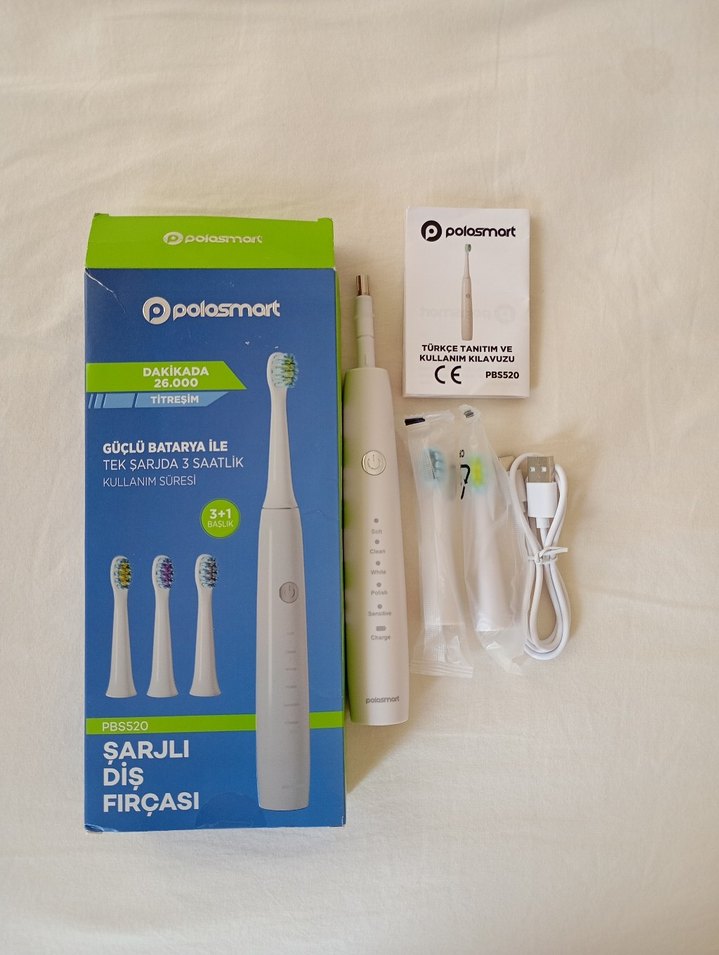 Polosmart şarjlı beyaz diş fırçası, dakikada 26.000 titreşim ve güçlü batarya ile tek şarjda 3 saat kullanım sunar. 2 başlık ve USB kablo içerir. Türkçe kullanım kılavuzu mevcuttur.