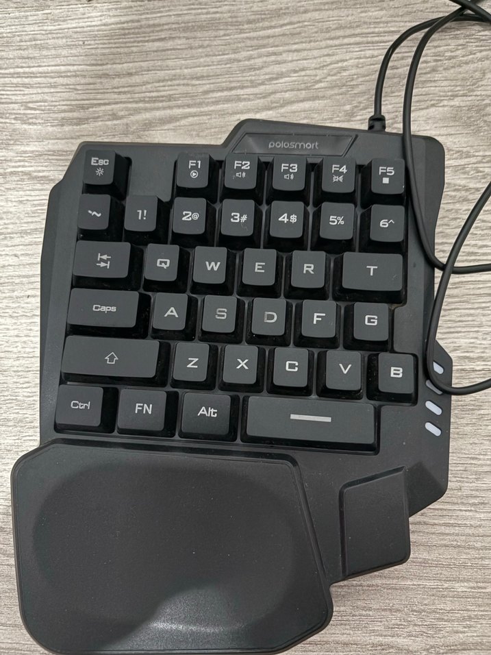 Polosmart siyah tek el klavye, T, FN, G ve Caps lock tuşlarıyla birlikte konforlu bilek desteğine sahiptir.USB girişlidir.