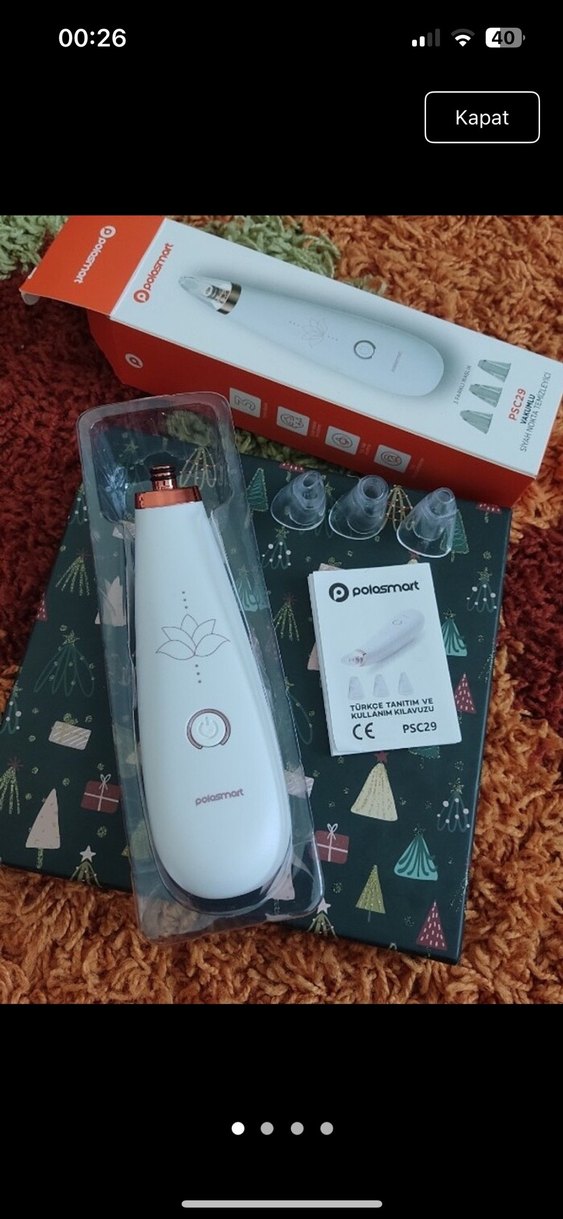 Polosmart beyaz renkli yüz temizleme cihazı, farklı başlık seçenekleri ve şık tasarımla sunulur. CE sertifikalı, model PSC29.