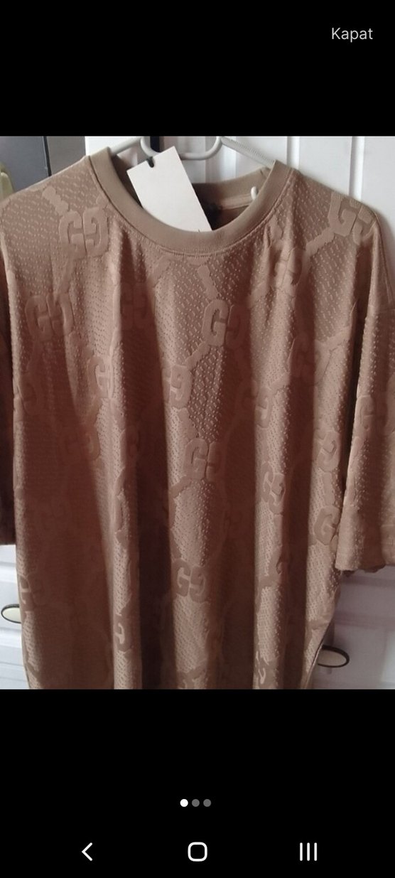 Drapeli, kısa kollu, bol kesim erkek tişörtü. parlak kahverengi gucci deseniyle günlük kullanıma uygun.