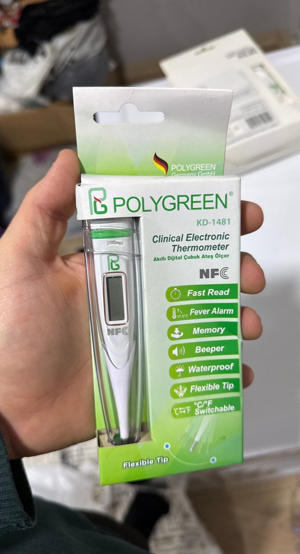 Polygreen KD-1481 elektronik klinik termometre; esnek uç, su geçirmezlik, hızlı okuma, ateş alarmı, hafıza ve bip sesi özelliklerine sahiptir. NFC destekler ve °C/°F arasında geçiş yapar. ️SIFIR ÜRÜNDÜR