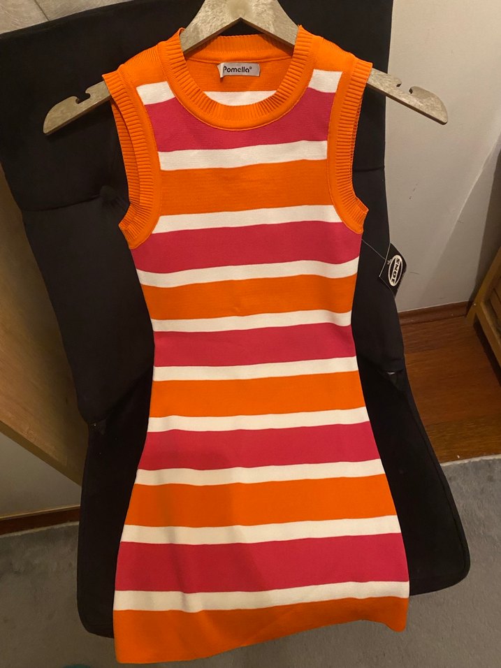Pomella markalı, turuncu baskılı, ince dokuma, bisiklet yaka ve uzun kollu kadın trikosudur. Normal midi boyda, günlük sokak stiline uygundur.